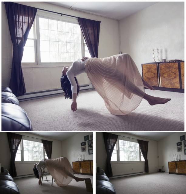 ▲利用椅子和木块让麻豆摆出“飘浮”的姿势后拍摄,再拍一张没有人物的场景,之后就进入后制软体中消掉除原画面中的支持物。Photo by Dani Diamond